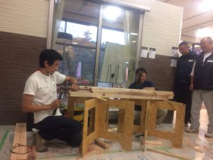 ラストに近藤&岩村で仕口加工実演。刻み自体ひっさびさで、かつ電動工具無しのガチ手加工。冷や汗モノでした。