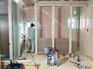 断熱、気密施工を終え、この時点で気密検査を行いました。隙間がないか=施工のミスのチェックを行えるとても良い機会です。もちろん、ミスの無いよう心がけて取り組んで入るものの、うっかりミスや思い込みを潰すためにも大切なチェック。